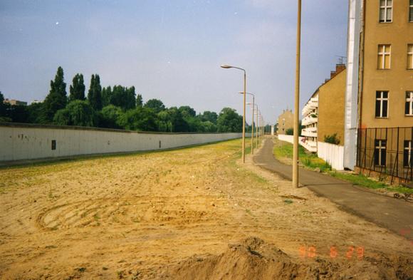 The former border strip with the East side of the Berlin Wall on the left, and light track, patrol road and inner Eastern wall on the right