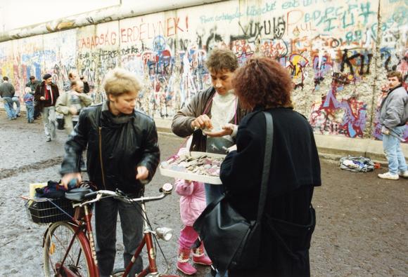 Mann der mit Bauchladen Mauerstücke verkauft, im Hintergrund mehrere Mauerspechte bei der Arbeit
