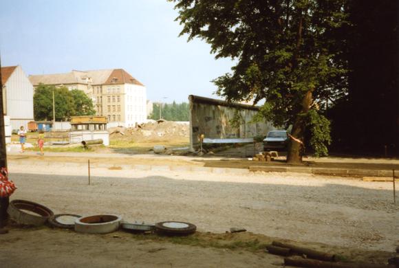A wasteland on the former border strip in Treptow borough (now Treptow-Köpenick) with the partially dismantled Berlin Wall and watchtower