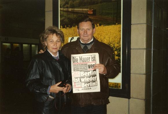 Ost-Berliner Ehepaar mit einer Ausgabe der Berliner Tageszeitung "B.Z." zum Mauerfall