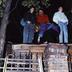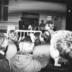 Jubelnde Passanten mit der Ausgabe der Berliner Tageszeitung "B.Z." zum Mauerfall an einer Bushaltestelle