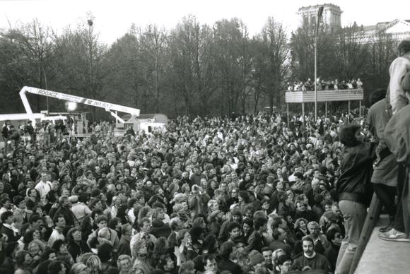 View from the top of the Wall onto a crowd; the Reichstag in the background