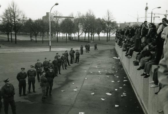 Berlin Wall (East), border guard, crane, crowd, mural crown