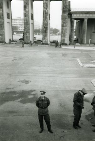 View onto border patrol officers from atop the Wall; the columns of Brandenburg Gate in the background