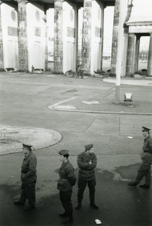 View of border patrol officers from atop the Wall; the columns of Brandenburg Gate in the background