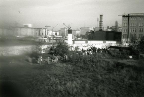 View from an M-Bahn - on the 1.6 km-long test track from the U-Bahn station Gleisdreieck to Kemperplatz - on the border strip. Visible are the Western side of the Berlin Wall, a watchtower and the the inner Eastern wall; the Television Tower in the background