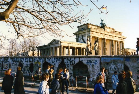 Menschen auf und vor der Berliner Mauer, dahinter das Brandenburger Tor
