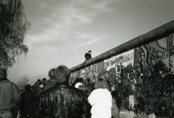 Onlookers in front of the Western face of the Wall; a young man sits astride the Wall