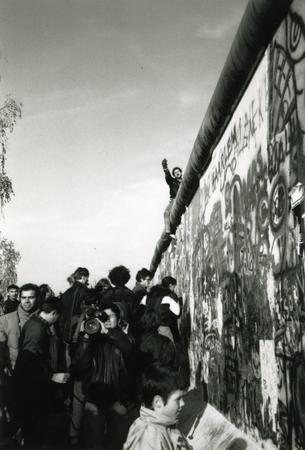 Onlookers and a cameraman in front of the West side of the Wall; a young man sits astride the Wall