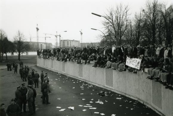 A crowd atop the Wall looks down at border patrol officers on the East side of the Wall