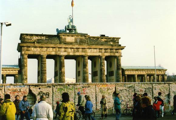 Pedestrians at the already partially demolished Wall; Brandenburg Gate in the background