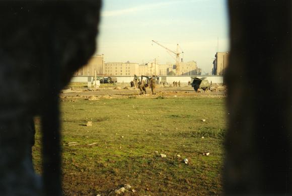 View through a hole in the Wall onto border strip construction work, probably in preparation for the border opening on November 12, 1989