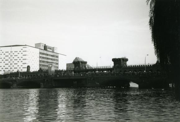 View from the bank of the Spree River onto Oberbaumbrücke, one of the seven road border crossings between East and West (Soviet and American sectors, respectively), and which could only be used by pedestrians.