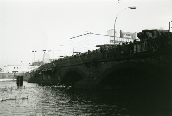 View from the bank of the Spree River onto a crowd on Oberbaumbrücke, one of the seven road border crossings between East and West (Soviet and American sectors, respectively), and which could only be used by pedestrians.