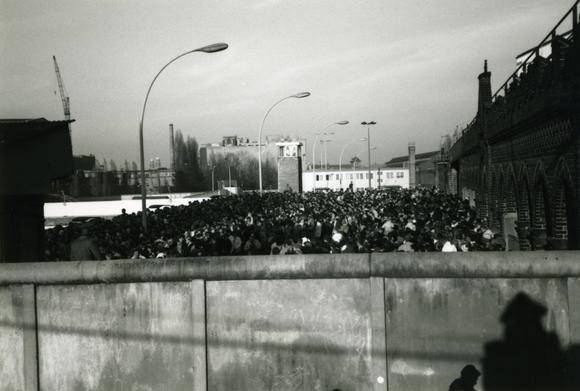 View over the Wall onto a crowd at Oberbaumbrücke, one of the seven road border crossings between East and West (Soviet and American sectors, respectively), and which was designated for pedestrians.