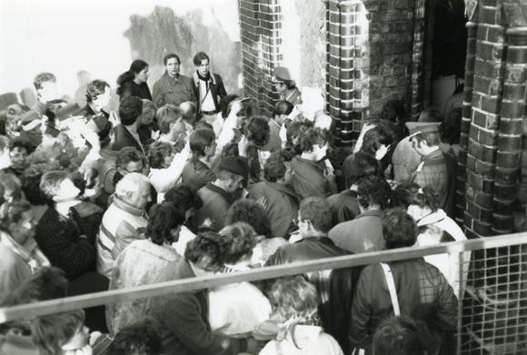 Ost-Berliner warten dicht gedrängt am Grenzübergang Oberbaumbrücke, während der Zeit der Mauer einer der sieben Straßenübergänge zwischen Ost- und West-Berlin (zwischen sowjetischem und US-amerikanischem Sektor), der nur von Fußgängern benutzt werden durfte.
