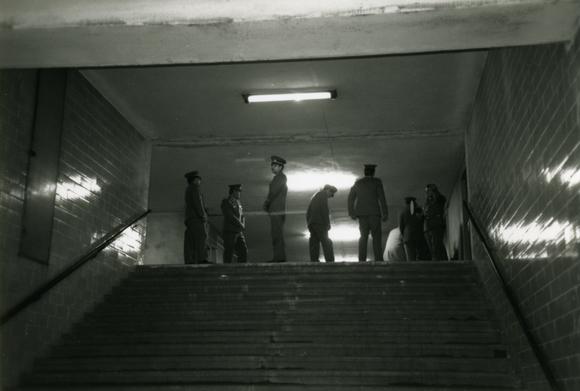 View onto a group of border patrol officers in the re-opened Jannowitzbrücke U-Bahn station, formerly known as a "Geisterbahnhof" (ghost station), which served as a new border crossing as of November 11, 1989