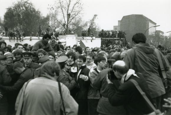 A crowd at the opening of the new Potsdamer Platz border crossing; the partially deconstructed Berlin Wall in the background