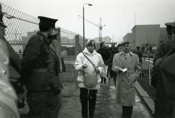 Passport control at Potsdamer Platz border crossing, which was opened on 12 November 1989; the partially dismantled Hinterlandmauer (inner eastern wall) in the background