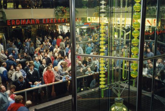 Crowd of people by the "Clock of Flowing Time" in the Europa-Center shopping mall, that just for once was open on a Sunday