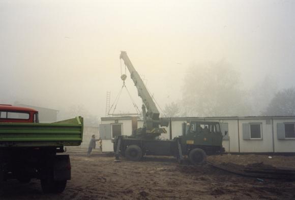 Aufbau von Zollhäuschen am Grenzübergang Teltow/Lichterfelde, der am 14. November 1989 eingerichtet wurde und das brandenburgische Teltow mit Berlin-Lichterfelde, einem Ortsteil des Berliner Bezirks Steglitz-Zehlendorf, verbindet