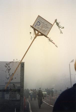 Sign, "P for Trabbies" at Teltow/Lichterfelde border crossing, which was installed on 14 November 1989 and connects Teltow (Brandenburg region) with Berlin-Lichterfelde, (Berlin district of Steglitz-Zehlendorf)