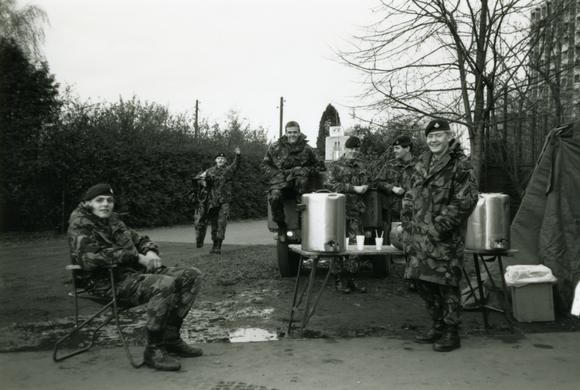 Soldaten an einem Kaffeestand der Britischen Armee, vermutlich in der Nähe des Grenzübergangs Falkenseer Chaussee, der am 13. November 1989 eingerichtet wurde