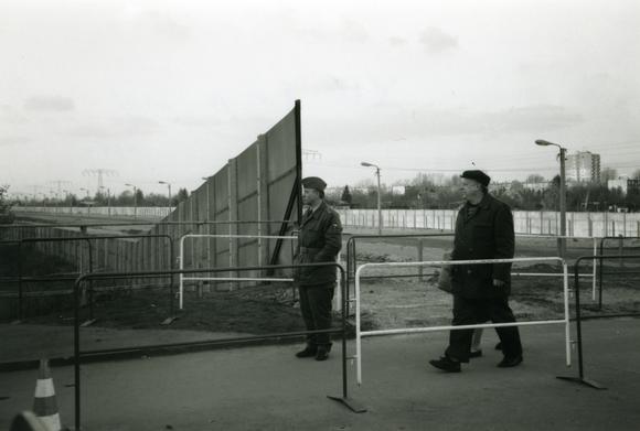 Border guard and pedestrian at a border crossing, presumably at Stubenrauchstraße/Massante Bridge