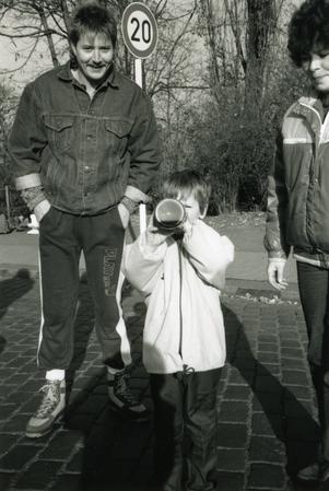 Familie am Grenzübergang Bornholmer Straße, während der Zeit der Mauer einer der sieben Straßenübergänge zwischen Ost- und West-Berlin (zwischen sowjetischem und französischem Sektor). Der Grenzübergang Bornholmer Straße war in der Nacht vom 9. zum 10. November 1989 der erste, an dem die Passkontrollen eingestellt wurden.