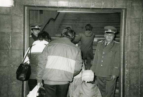 Two border guards control the entrance to the border crossing at Friedrichstraße railway station, the only rail crossing between East and West Berlin during the time of the Berlin Wall