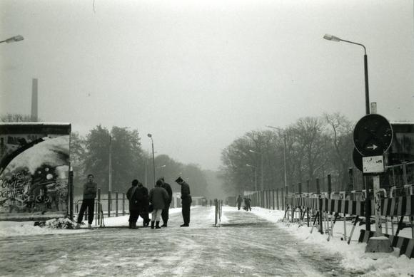 Border guards in conversation with pedestrians at the border crossing at Puschkinallee (Treptow) /Schlesische Straße (Kreuzberg), that was installed on 11 November 1989; the partially dismantled Wall to the left and the right, with a view along Puschkinallee