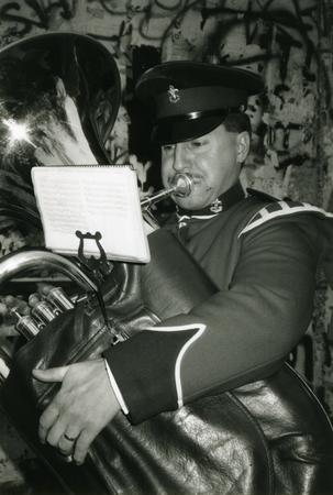 Tubist des Blasorchesters der Britischen Armee am Grenzübergang Potsdamer Platz, der am 12. November 1989 eingerichtet wurde