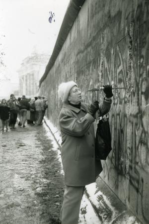 Berliner Mauer (West), Hammer, Mauergraffiti, Mauerspecht (Person), Mehrere Personen, Meißel, Meißelspuren, Schnee, Winter, Älterer Mensch