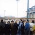 View of the border guards from atop the Wall near Brandenburg Gate, with a dismantled border warning sign in the foreground