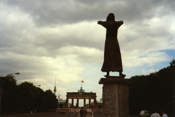 View of the Western side of the Berlin Wall at Brandenburg Gate; the bronze statue "Der Rufer" by Gerhard Marcks ("the caller", erected on the median in 1989) in the foreground