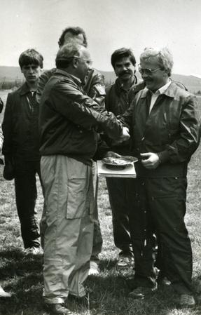 "Mr. Graßhoff, chairman of the airfield Hattorf am Harz presents Peter Kettner, chairmain of the Nordhausen Flyers' Club, with a gift."