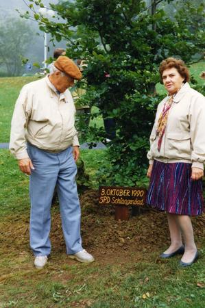 Standing in front of the beech tree planted on 3 October 1990, known as a "beech tree of unification"