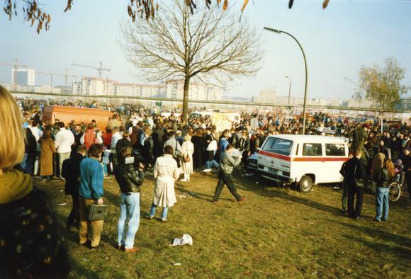allies, Berlin Wall (West), camera crew, crowd, military vehicle, opening of the border, television camera