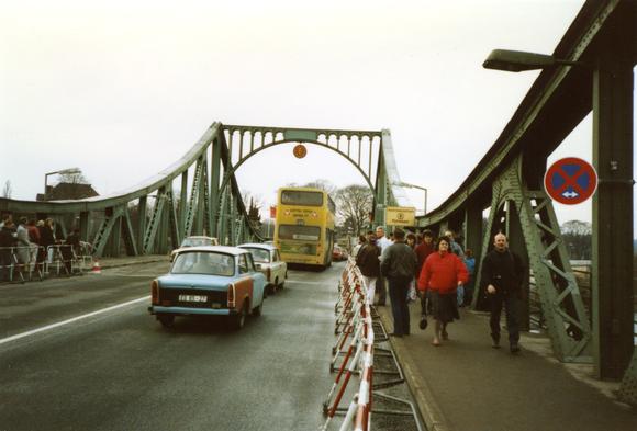 Ein Bus der (West-)Berliner Verkehrsbetriebe (BVG) auf der Glienicker Brücke, die über die Havel hinweg die Städte Berlin und Potsdam verbindet und am 10. November 1989 erstmals seit 1961 wieder für Menschen aus der DDR geöffnet wurde