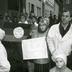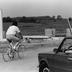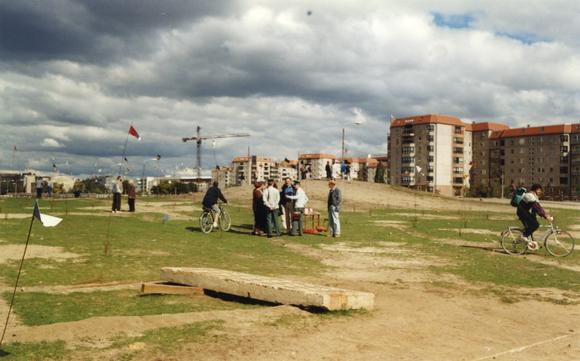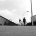 Passersby near Potsdamer Platz, in front of the hill above the underground rooms that served as Adolf Hitler's headquarters, known as the "Führerbunker", shortly before the end of the Nazi regime. In the two years preceding the fall of the Wall, the bunker was excavated and removed.