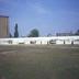 Blick von der damaligen Berliner Magnetbahn aus in den Grenzstreifen mit Wachtturm, Westseite der Berliner Mauer und Hinterlandmauer ,View from the former Berlin Maglev train onto the border strip. Visible are a watchtower, the Western side of the Berlin Wall and the inner Eastern wall.