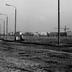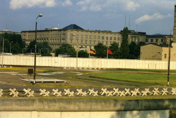View across the Western side of the Wall onto the border strip; the Berlin House of Representatives in the background. The watchtower visible above the inner Eastern wall still stands today.