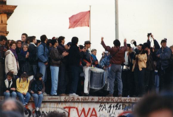 Berlin Wall (West), crowd, mural crown, musician, red flag