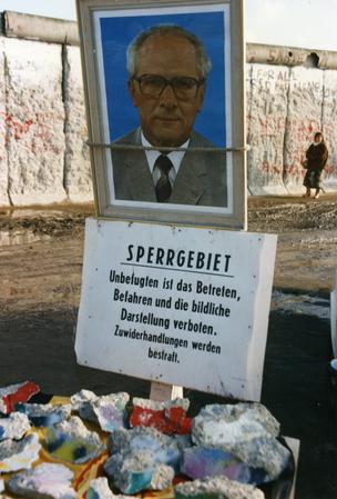 Honecker-Porträt, Schild "Sperrgebiet" und Mauerstücke