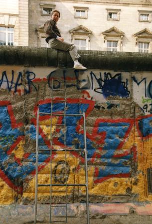 A man astride the already badly chipped Berlin Wall in front of the Berlin House of Representatives