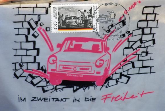 Photo (with stamp) showing a drawing of a car driving through the Berlin Wall