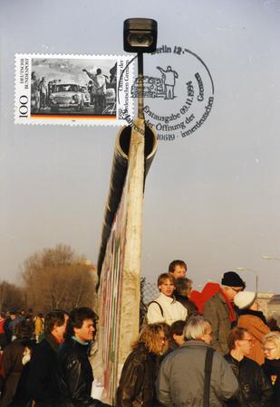 Photo with a stamp showing bystanders at the Berlin Wall at the Potsdamer Platz border crossing