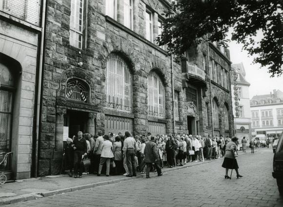 Warteschlange vor einer Filiale der Sparkasse in Gotha, weil anlässlich der Währungsunion am 1. Juli 1990 alle Bankkonten umgestellt werden mussten