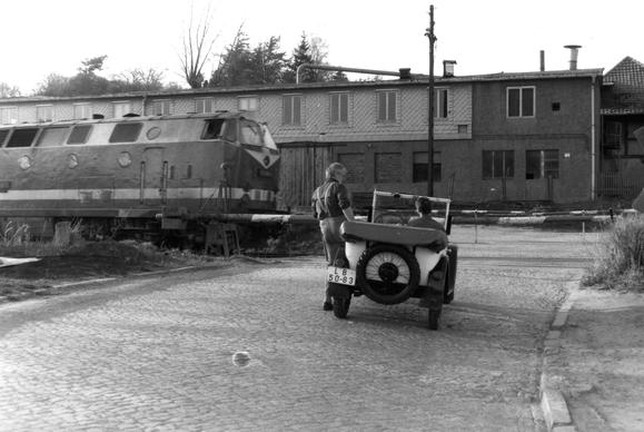 Oldtimer an einem Bahnübergang