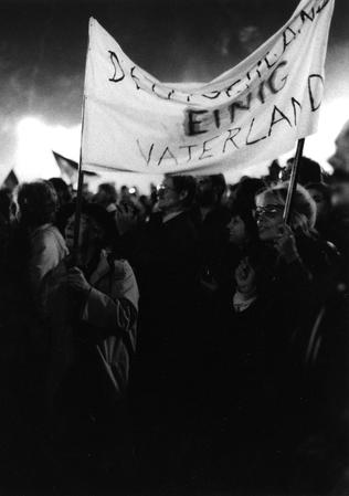 Menschenmenge mit Transparent bei der Wiedervereinigungsfeier vor dem Reichstag